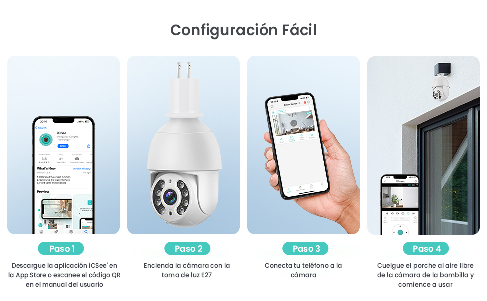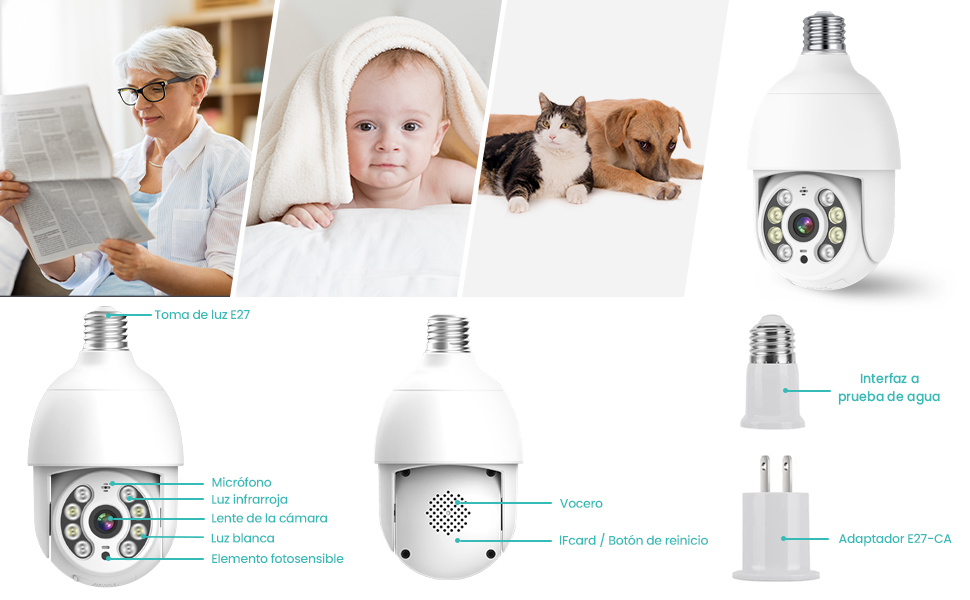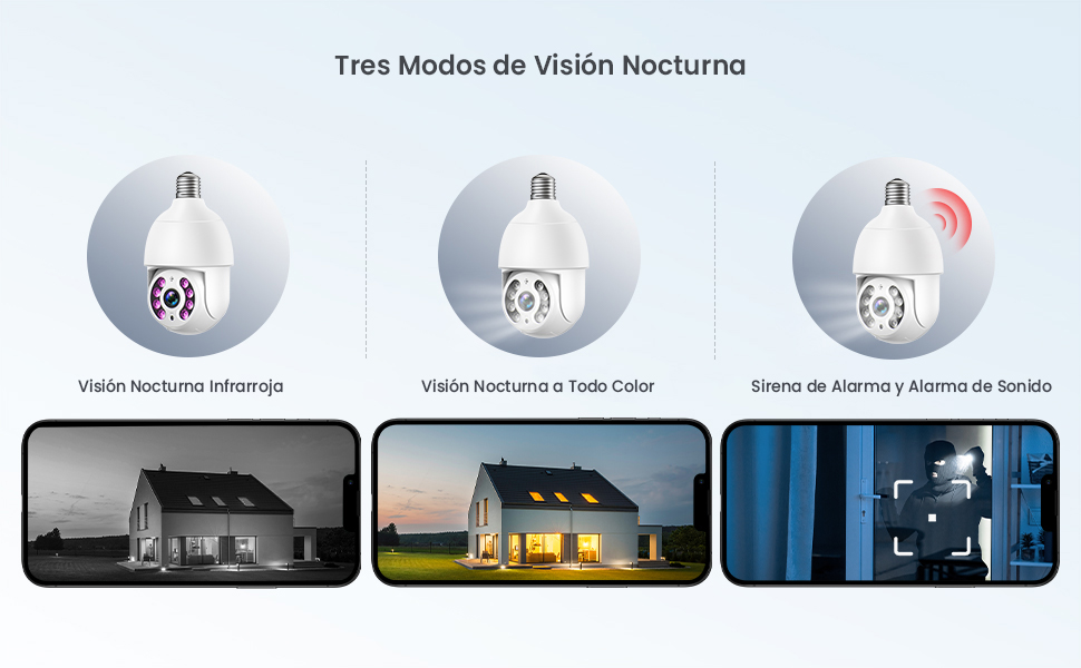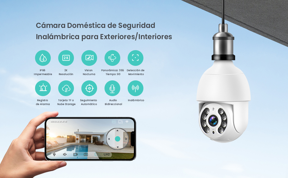 La Cámara de la bombilla no tiene batería, necesita instalarla en el enchufe de la bombilla y encenderla. Cuando encienda la energía, espere un minuto y la Cámara de la bombilla girará y se probará a sí misma para demostrar que funciona correctamente. Tenga en cuenta que la luz de Estado no parpadea, es normal.