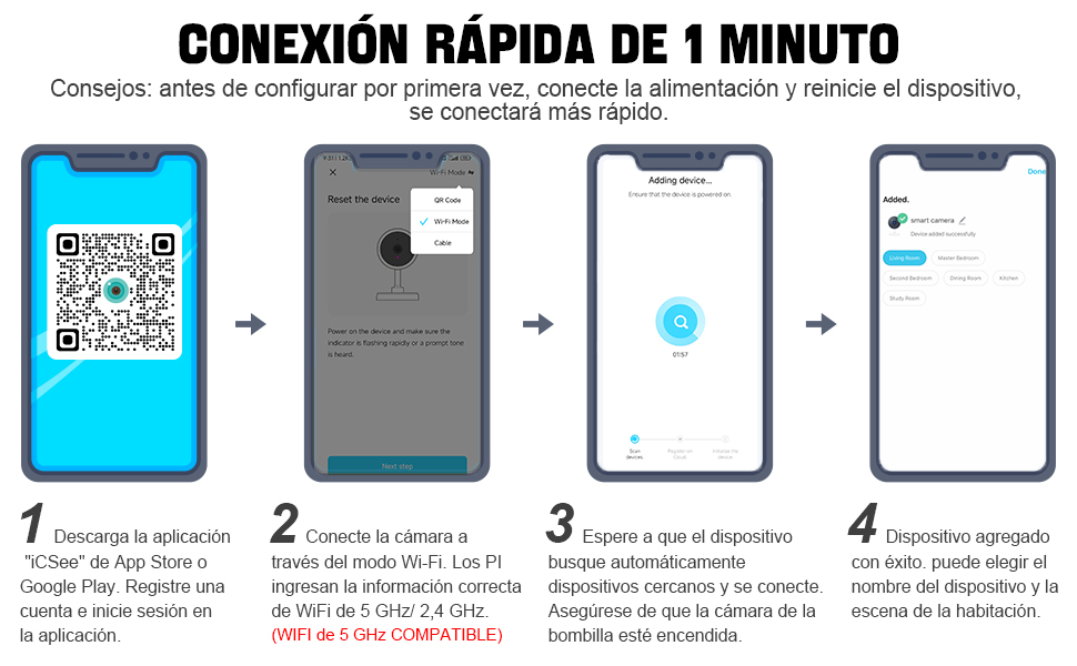 1. Asegúrese de que la Cámara de la bombilla está energizada y auto – probada. 2. Por favor, instale esto cerca del router, la Cámara necesita una fuerte señal Wi – Fi. 3. Asegúrese de que su información WiFi ha sido introducida correctamente. 4. Por favor, reinicie la Cámara de la bombilla, la primera configuración toma más tiempo.